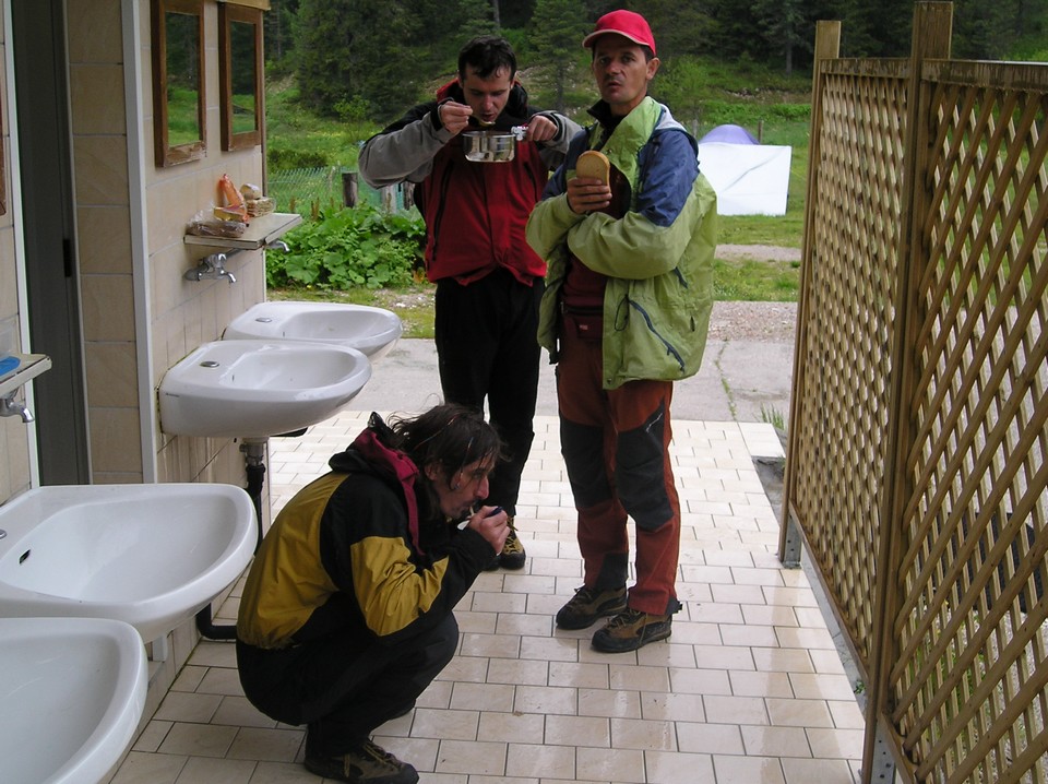CIME DI LAVAREDO (ITA) -- Jožo Balala, cenzúroval: Jano Bušfy -- 6.2007 -- Nakoľko na expedicii Tre Cime di Lavaredo sa nič zvláštneho nestalo, bolo by zbytočné písať nejaký obsiahlý článok. Pre ilustráciu budú postačovať len fragmenty z Jožovho denníka. Expedície sa zúčastnili: Jožo Balala, Ľuboš Bujný, Jano Bušfy a Vlado Vričan NEDEĽA Asi po hodine cesty autom smer Taliansko, pri Beckove som zrazu začal premýšľať o topánkach a zrazu mi napadlo, že tie moje zostali doma v poličke. A tak sme sa na prvej otočke vrátili. Na druhý pokus sa nám už podarilo skutočne odísť. V aute: Ľuboš na otázku "Kde budú najbližšie ME vo futbale" odpovedal: "V Ázii". Na juhu Rakúska zrazu začalo pršať s krásne azúrovo čiernych oblakov. Už večer sme sa boli prejsť na Auronzo pod Cimy. Ľubošovi Dolomity pripomínajú naše Predhorie pri Považskej Bystrici. Tak áno, skutočná podoba... PONDELOK Budík nám zacinkal o 4:30 a vonku bola zase "plechovo" čierna obloha a pršalo. Tak ako včera aj dnes v horskom stúpaní autíčko nie a nie zaradiť dvojku a tak to dreme na jednotke. Po rannej prehánke sme začali liezť na Cimu Grande o 9:00, čiže neskoro. Ľuboš sa v druhej štvorkovej dĺžke zbadal že všetky štvorky sú rovnako veľké a ťažké My dvaja sme sa zbadali o 12:30, keď si Janko spravil matematickú olympiádu a vypočítal že na vrchole Cimi budeme až o šiestej večer ,a keďže aj obláčiky sa začali zase zbierať začali sme zlaňovať. Začínam zlaňovať bez osmy - len s prusíkom. A dobre sme spravili, lebo po dotyku so zemským povrchom začalo pršať. Večer v kempe sme pre dážď museli variť polievku pod strechou pred záchodmi. Ideme do Cortiny hľadať Informácie. Tam nás slečna nás "potešila" - pršať bude celý týždeň Dnes sme si dali aj sprchu, takže v stane nespia zvery ale ľudia. Janko dnes na Auronze videl prvý krát sa bozkávať 2 gayov a bol s toho unesený. Kto vie či sa nepreorientuje, lebo nikdy nie je neskoro. UTOROK Cesta pod Mt. Averau bola skutočne po vrstevnici, len trocha šikmej Po prekonaní ťažkého nástupu sme začali zase liezť skoro ráno o desiatej Prvá dĺžka bola vlhká ako mladá nevesta, ale Jolko to dal Po dvoch dĺžkach zase "chčie" Po 30 minútach čakania na štadne pod "previsom", keď sme už boli mokrý ako kurence, sme začali zlaňovať V Cortine sme našli internet, na každom serveri bola iná predpoveď tak sme si vybrali tu najlepšiu. Po troch dňoch sme zistili, že tie dve veže čo vidíme zo stanu a sem tam vykuknú spoza oblakov sú západná a veľká Cima. STREDA S Jankom lezieme na najväčšiu vežu v oblasti Cinque Tore, svieti slnko a za nami lezie nebezpečne pekná anglicanka - čierne vlasy, modré oči, jedna ruka.. Janko ako vždy poblúdi do akéhosi divokého traverzu, ešte že moje škuľavé oči si všimnú traverz z borhakov. Celý čas mi je zle, musíme zlaniť. Dobre sme urobili - začalo pršať intenzitou "do minúty úplne mokrý" a ledvom dobehneme do auta. Za chvíľu príde aj Láďo, len inteligent Ľuboš nás čaká pri chate pod strechou Sedíme na námestí v Cortine a Ľuboš obzerá šestnásťročnú tridsiatničku ( alebo tridsať ročnú šestnástku? ) Zase leje.. Večer nemôžem zaspať - mám vetry. ŠTVRTOK O 5:00 sme pod nástupom Cimi Grande, po krátkej meditácii a fotení východu slnka začíname liezť. Lezieme skutočne rýchlo, vyrušia nás len blázni na padákoch, ktorí skáču z vrcholu Cimy. Sme len 100m od ringbandu (prstenec pod vrcholom Cimy), keď z ničoho nič zahrmelo, a za chvíľu sa začalo aj blýskať, liať a padať krupec a po skale začali tiecť úplné potoky a vodopády. Mokré lano sa stále motalo. Vytvárame nový osobný rekord v mokrom zlaňovani 500m - za dve a pol hodiny Pochvaľujeme si že pri zlaňovani nepadali kamene, ale Láďo nás rýchlo vyviedol s omylu. V kempe sa sušíme a ideme si kúpiť víno.. PIATOK Je čas sa vrátiť domov, lebo aj tak bude do nedele pršať. Odchod naplánovali zle, akurát dnes ráno musel prísť autobus plní mladých čučoriedok z Česka. Teta kempárka nám dala na pamiatku za naše "hrdinské" výkony tašky. Cesta domov bola chvalabohu bez problémov a večer 18:30 sme doma. Fotogaléria Zaujimavé linky o oblasti Cortina d'Ampezzo: Pohľad na Tre Cime z vesmíru Webcam Cortina d'Ampezzo Webcam Cinque Torri |